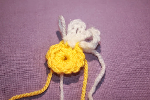 If this is your second daisy then repeat until the last treble stitch, as this will be where we join your current daisy to the previous one. When you reach the last treble make your first petal than chain another 8 and then cut the white yarn leaving enough yarn for a double crochet and a slip stitch.