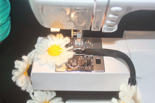 Get your elastic and before you cut to your desired length you will need to sew it to one end of the daisy chain. I double folded mine over the middle side petal and did a zig zag stitch over it. Place the chain on your head where you like it to sit and stretch the elastic along your hairline so that it feels tight enough to hold the daisy chain in place once the elastic is sewn to the other end of the daisy chain. (My elastic measured roughly 16cm un-stretched) then double fold over the last daisy and sew in place.