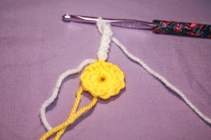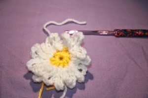 If this is your second daisy then repeat until the last treble stitch, as this will be where we join your current daisy to the previous one. When you reach the last treble make your first petal than chain another 8 and then cut the white yarn leaving enough yarn for a double crochet and a slip stitch.