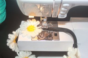 Get your elastic and before you cut to your desired length you will need to sew it to one end of the daisy chain. I double folded mine over the middle side petal and did a zig zag stitch over it. Place the chain on your head where you like it to sit and stretch the elastic along your hairline so that it feels tight enough to hold the daisy chain in place once the elastic is sewn to the other end of the daisy chain. (My elastic measured roughly 16cm un-stretched) then double fold over the last daisy and sew in place.