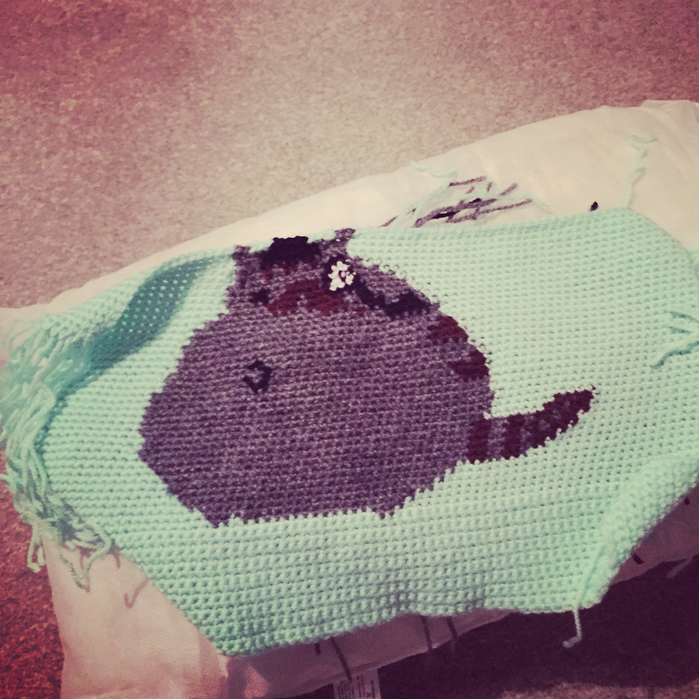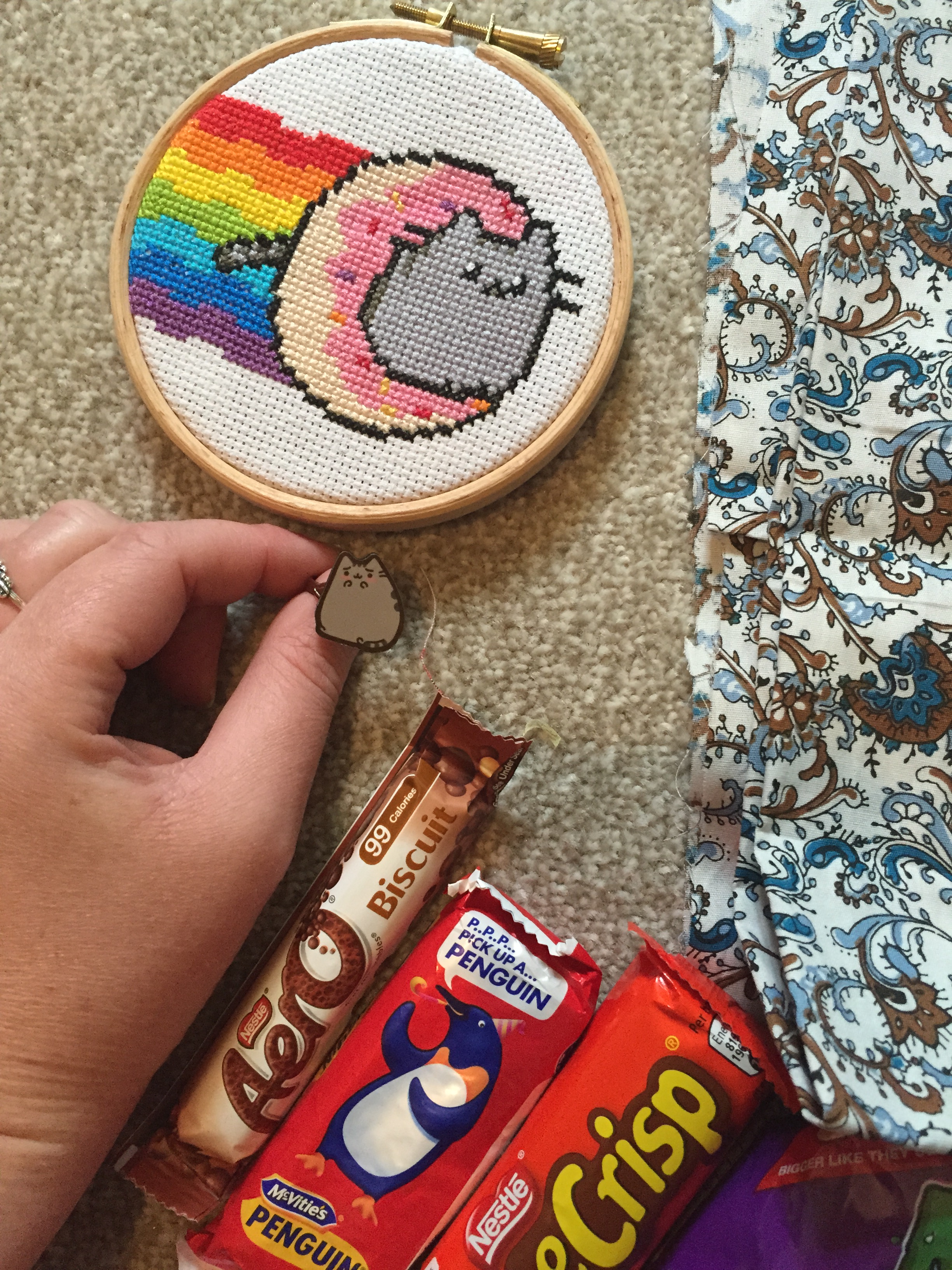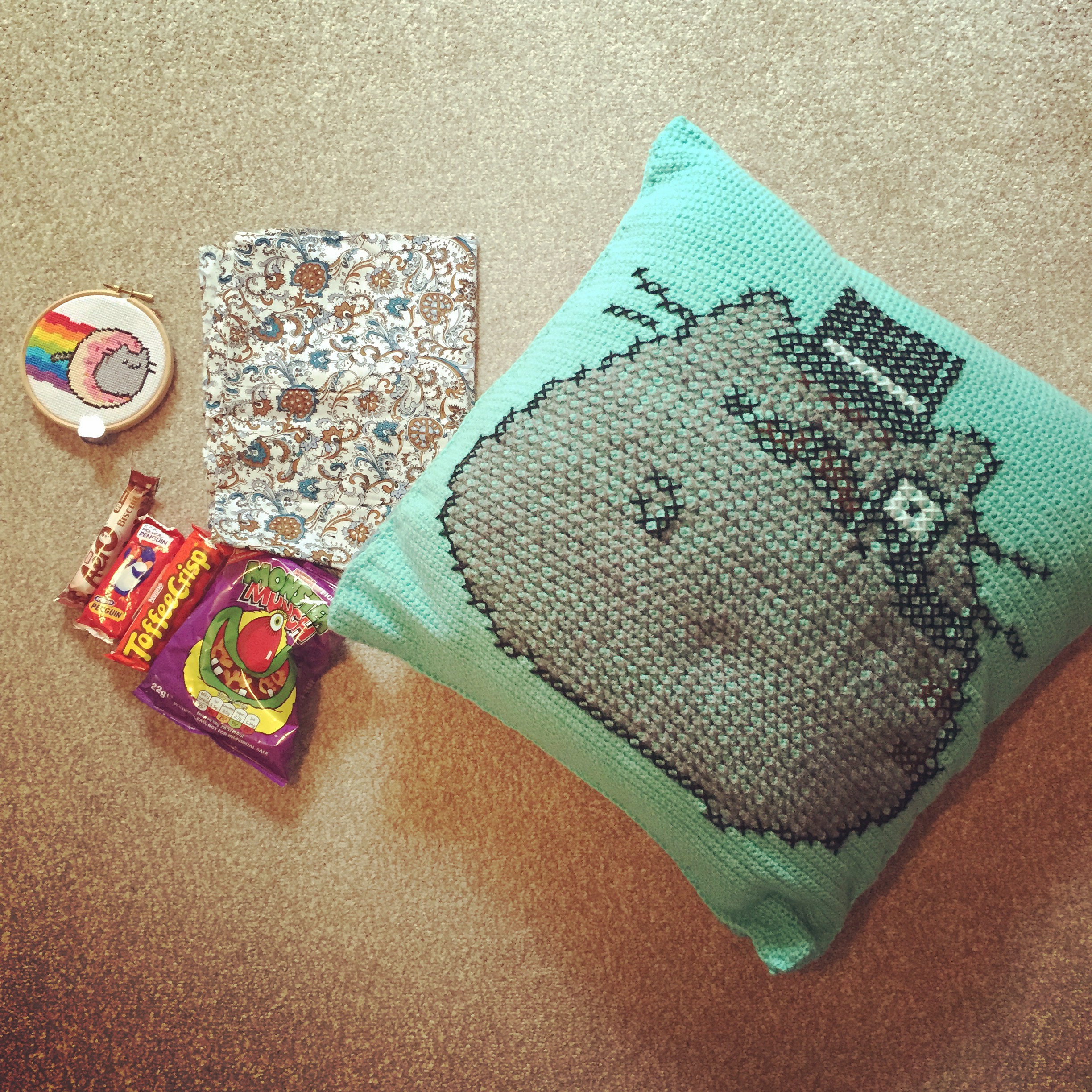 these were my first two attempts and they just looked rubbish!! so here is the finished swap items.. I’m so happy with the way everything turned out. I did a cross stitch, and the cushion picture was cross stitched onto the crocheted cover. I also got a pusheen ring and sent some chocolate and crisps too!