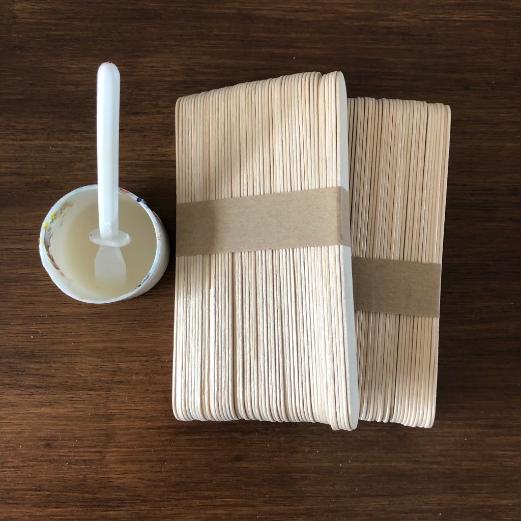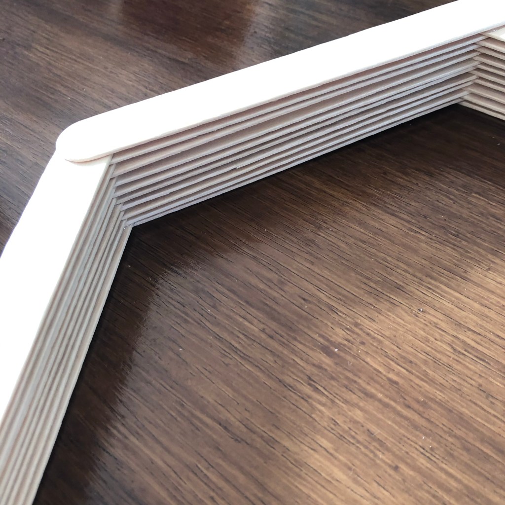 - Leave to dry slightly and then start the next layer by dabbing a bit of PVA to each corner and add another stick, layering as you go. You’ll always end up with one stick not having either ends layered.