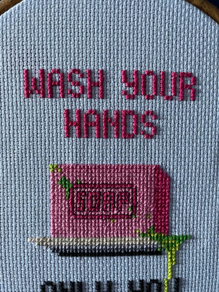 It does need the back finishing off as I’d used a scrap piece of blue aida I had and it was only just wide enough to fit in the hoop. One day I might glue it down properly, but unless you’re really looking at it from the side you can’t see it so much.