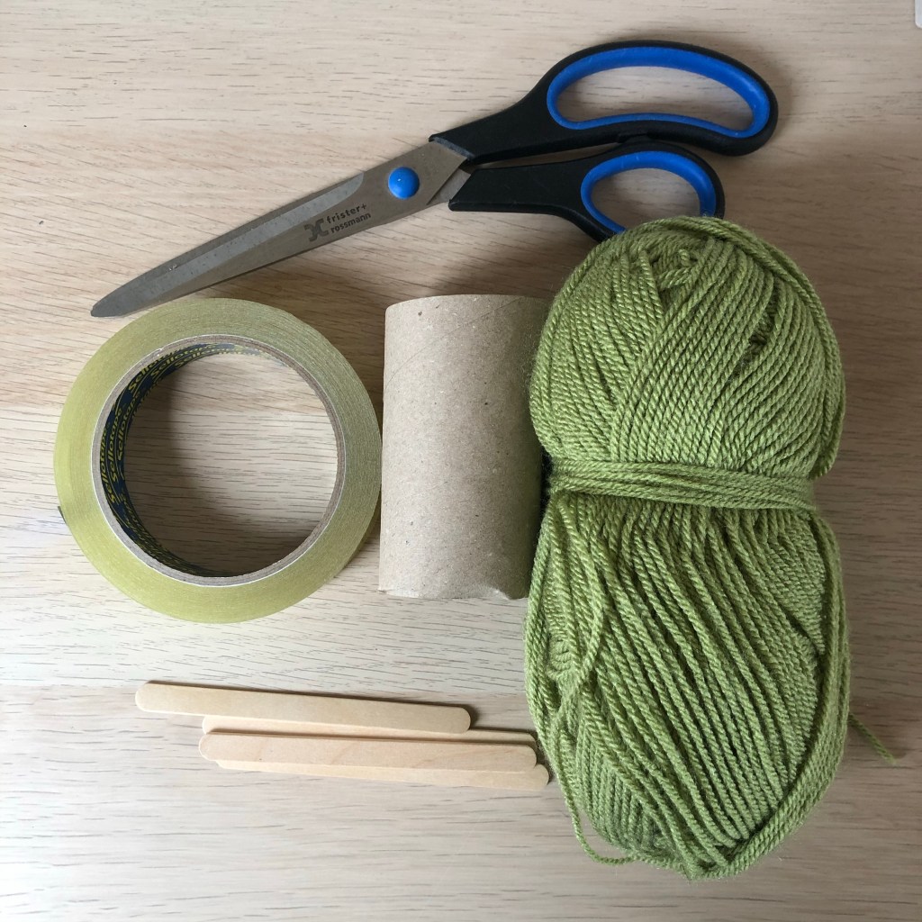 - Unravel your wool so that you have about 10 inches of wool and place the stand inside the toilet roll so that you have about 5 inches hanging out the bottom of the tube