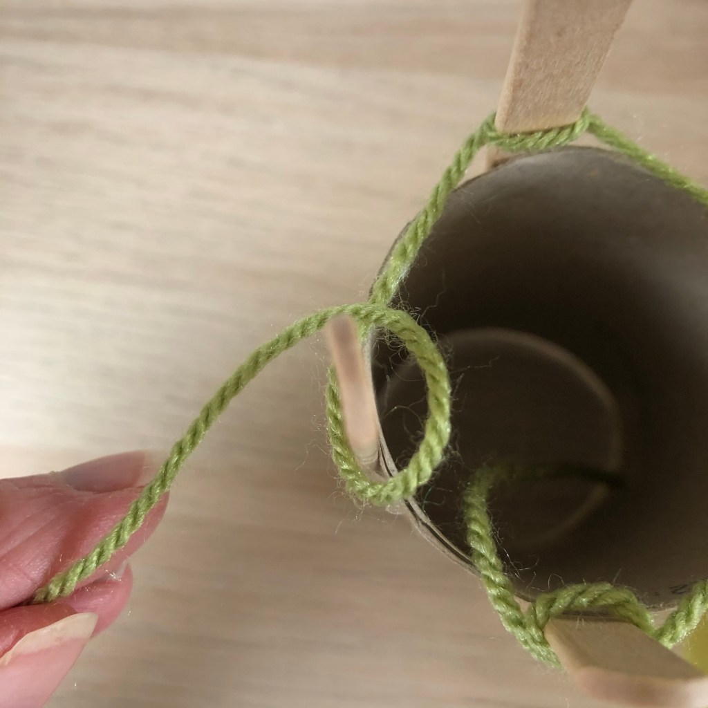 - Wrap your wool around one stick clockwise and then wrap round stick 2, 3 and 4 and bring your wool to the front of stick 1 – when looking down the tube you should have a little square