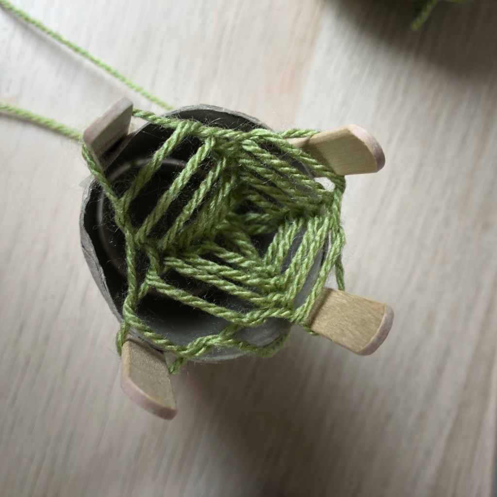 - When you have reached your desired length finish the round on stick 4, cut your wool at the top of the toilet roll, leaving about 6 inches of wool free.